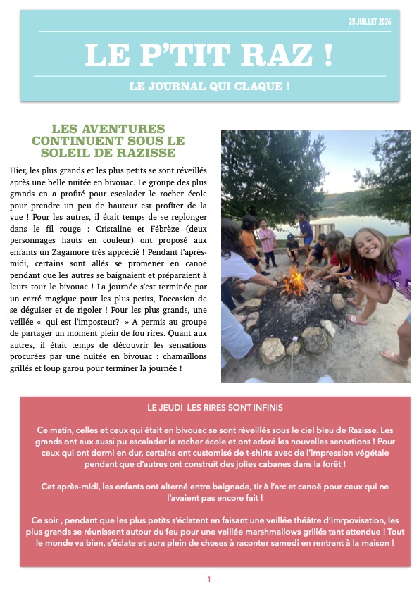 Multisport – Le P’tit Raz du 25/07/2024 26 juillet 2024 / Bonjour tout le monde ! Pour suivre les aventures de vos enfants, vous pouvez consulter le P’tit Raz en cliquant sur les photos juste ici !
